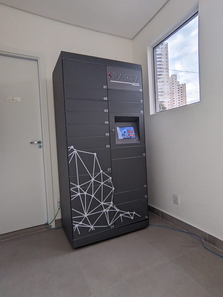 Armário Locker para receber as encomendas, o Chez Anália conta com essa maravilha da tecnologia que o prestador de entrega deposita a encomenda do cliente e por um QR code que chegará em seu celular e ele retira ela no armário apenas apontando para o dispositivo.